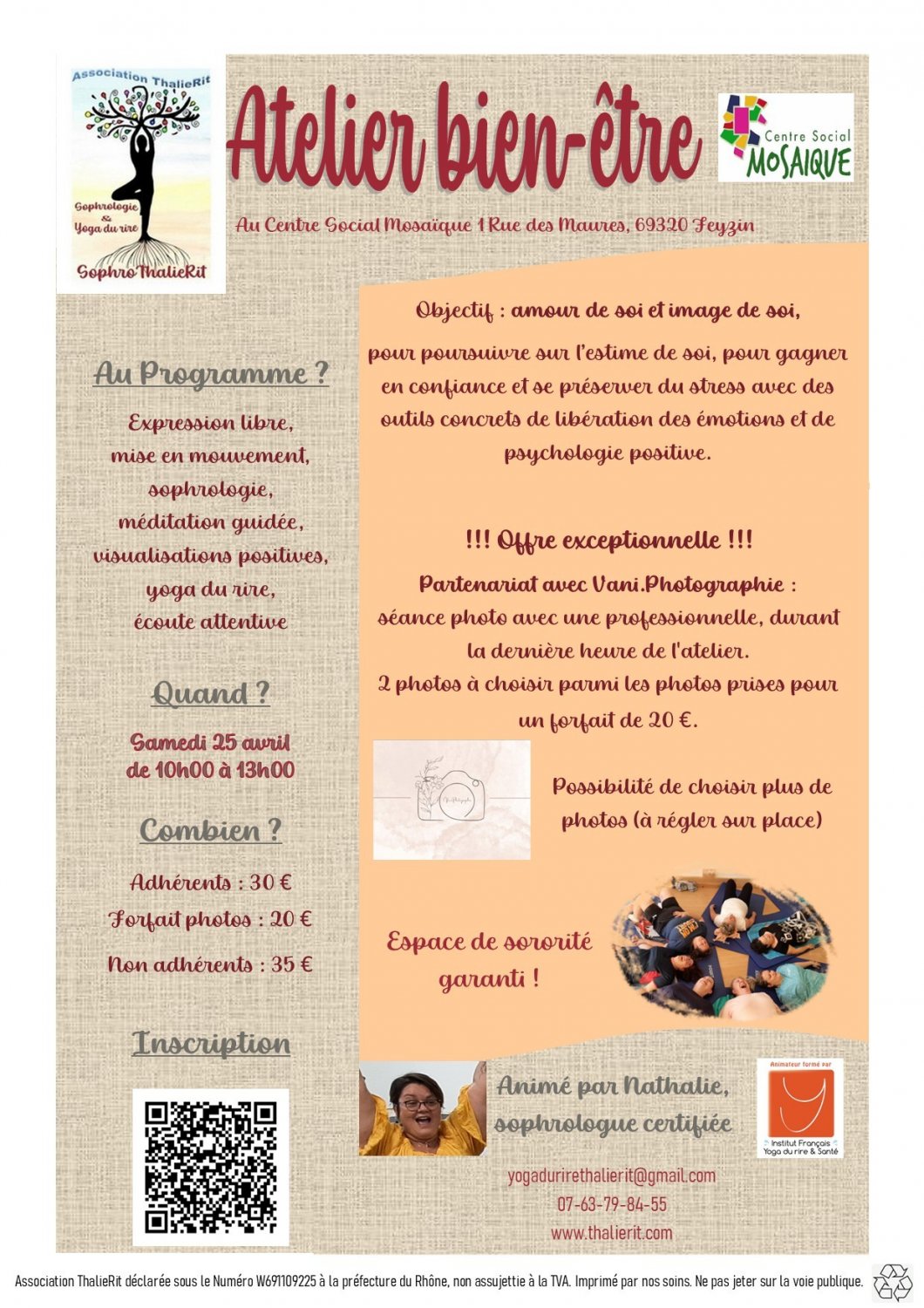 Atelier bien-être "amour de soi et image de soi" : sophrologie, yoga du rire, outils de psychologie positive, outils d'EFT, coaching pour libérer votre expression écrite et corporelle... Ainsi qu'un partenariat exceptionnel avec Vani.Photographie !!