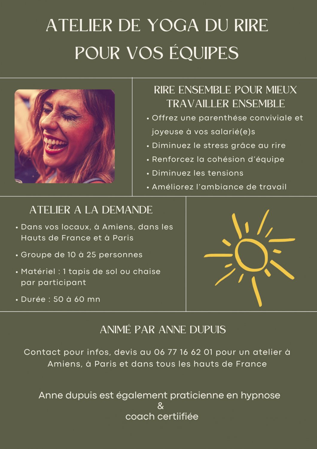 Un atelier de yoga du rire a lieu dans vos locaux et dure de 50 mn à 1 heure. Pensez à l'intégrer à vos événements (séminaires, journée bien-être...) pour vous démarquer et offrir une parenthèse ressourçante à vos équipes.